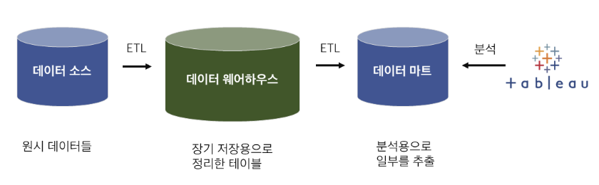 즉, 각종 시스템에 연결되어 있는 데이터베이스에서 특정 형태로 사용할 수 있게 가공된 데이터를 모아두는 장소라고 보시면 됩니다.